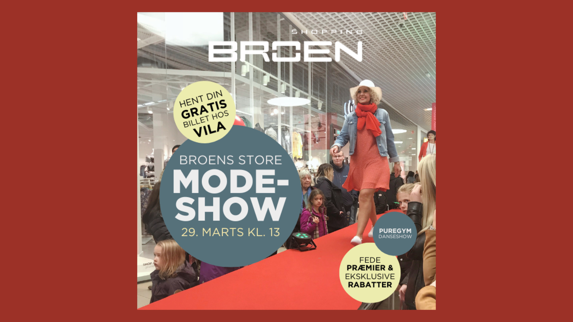 BROEN Shopping genopliver catwalken med deres populære modeshow, hvor man kan opleve de hotteste forårstrends præsenteret live. Arrangementet lover at presse stemningen helt til tops med en DJ, der sætter tonen fra start og et energifyldt danseshow afholdt af PureGym, før modellerne indtager scenen.
