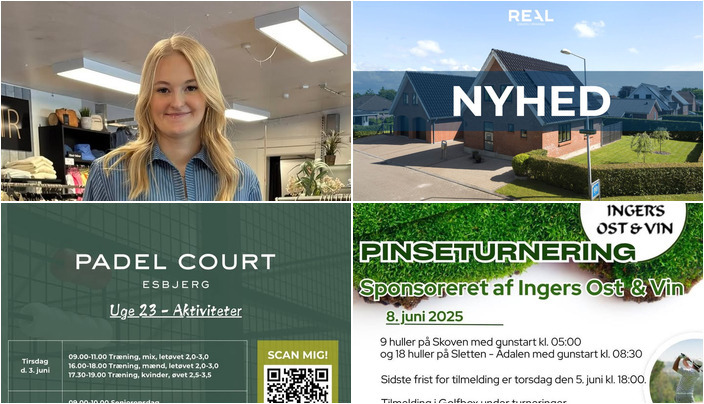 Padel Court Esbjerg fejrer sommeren med udendørsbaner, træning og en kommende 2-års fødselsdagsfest den 14. juni. De planlægger også en Padel Sommercamp i uge 32 og afholder en Americano turnering i weekenden. Der er en konkurrence, hvor man kan vinde et månedsmedlemskab. RealMæglerne Esbjerg og Bramming introducerer en ny rummelig og energivenlig familievilla på Harvevænget 16, der er blevet moderniseret til energiklasse B. Breinholtgård Golf Klub minder om tilmelding til årets Pinseturnering. ROSENGREEN tilbyder en smart bluse fra Infront til nedsat pris fra 500,- til 200,-. For mere information kan du læse de oprindelige opslag.