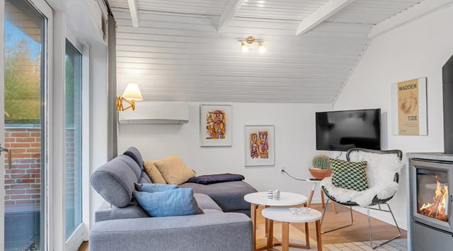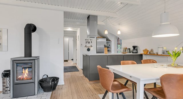 Der er installeret et nydeligt køkken, med flot hvid nedfældet håndvask og god plads til spisebord samt indretning af hyggelig opholdsstue, med brændeovn som er med fedtsten, der er endvidere dobbeltdør til terrasse samt massivt trægulv, malet rustikloft samt synlige hanebånd.
