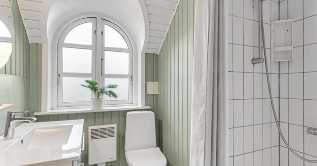 Nydeligt badeværelse, med hvide klinker på gulvet og i bruseniche, pænt badeværelses miljø skab, med nedfældet håndvask, buet kvistvindue med flot lavet buet inddækning. Der er synlige hanebånd i loftet samt malet hvidt rustikloft.