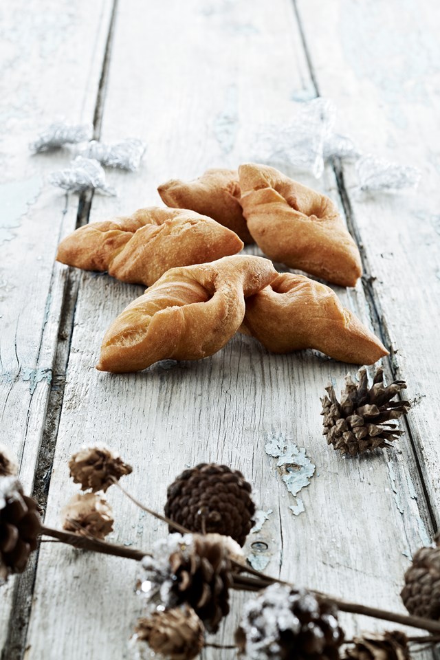 Klejnen: Ligesom med brunkagen er det bedst at lave dejen dagen før, og her skal der ikke spares på citronen. Når klejnen skal formes, skal de ikke laves for tykke, da det giver større risiko for, at kagen bliver tør. Ved kogningen skal du holde godt styr på temperaturen af olien, som skal holdes præcis ved 180 grader under hele tilberedningen. Hvis den svinger bare 10 – 20 grader, går det udover kvaliteten. Du kan i princippet bruge alle olier, og du kan også koge klejnerne i svinefedt, der dog afgiver en karakteristisk smag, som nogle elsker og andre ikke. Når klejnerne lægger sig i overfladen, skal de vendes, så kagerne kan få den gyldne farve på begge sider. Herefter tager du klejnerne op af gryden og lægger dem på et viskestykke eller køkkenrulle, der kan tage den overskydende olie.