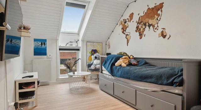 Dejligt stort lyst soveværelse, med et pænt pålagt " skibs planke " laminatgulv pålagt, smukt ovenlysvindue, malet rustikloft samt stort garderobeskab.