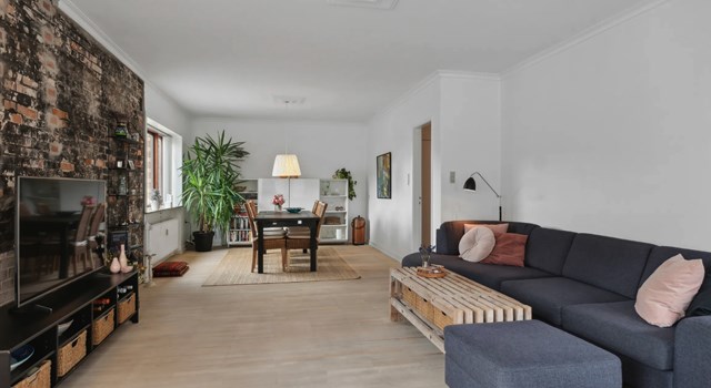 Ejendommen skiller sig ud med sin facade af gule sten og elegante mørke trævinduer, hvilket giver et charmerende og markant udtryk. Indenfor finder man blandt andet et stort lyst køkken udstyret med moderne hvidevarer, og en fantastisk opholdsstue med en flot karnap, der strækker sig mod Strandbygade. "New Yorker"-væggen i opholdsstuen tilføjer en trendy atmosfære.